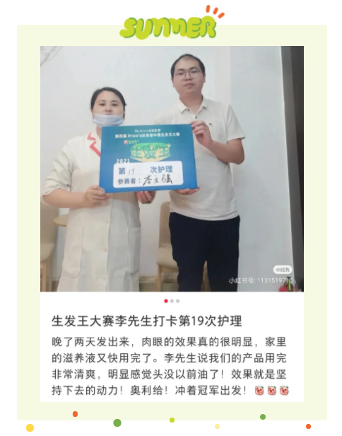 李先生参赛两个月来的护理阶段性效果,店员们的感觉也很明显,南艳护理师说,第一次李先生过来护理时只要一碰他的头,基本满手都是掉的细碎发,现在洗的时候包括用净化按摩梳的时候掉发很少了。看来头皮环境确实改善不少啊!